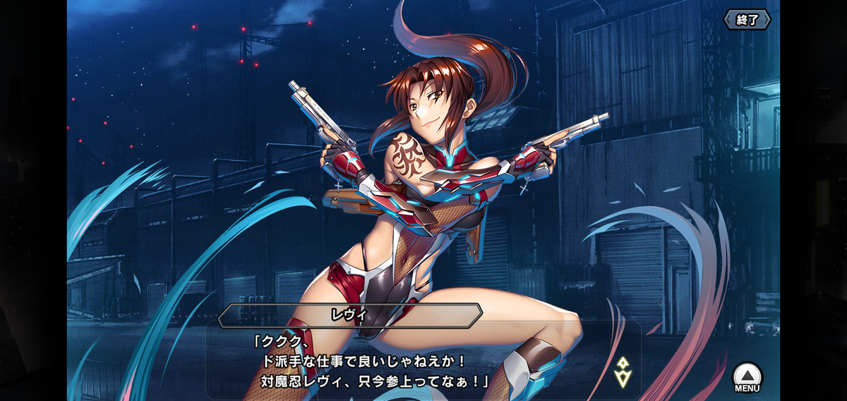 言ってるいつもどおりの下品な台詞は対魔忍以上だし、人の生き死にや18禁要素もコラボに適してましたね。ただ、レヴィやバラライカもあまりにダークな部分は抑えめで。