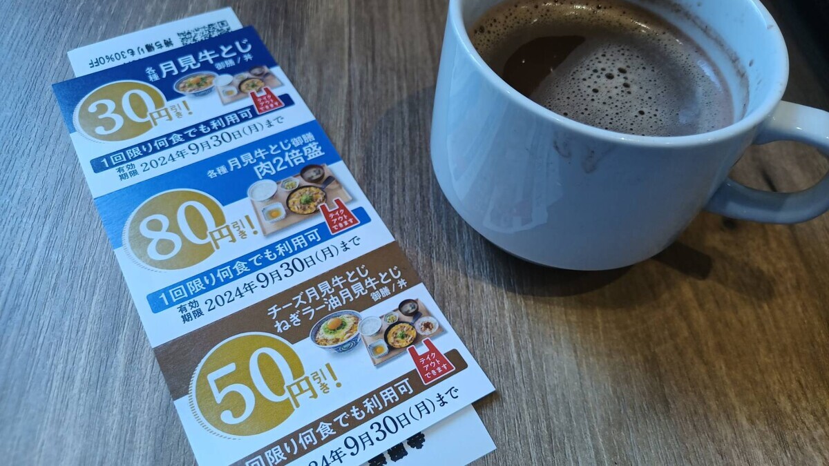 貰った月見牛とじクーポン、肉2倍を食べるならアプリクーポンよりオトクかぁ。