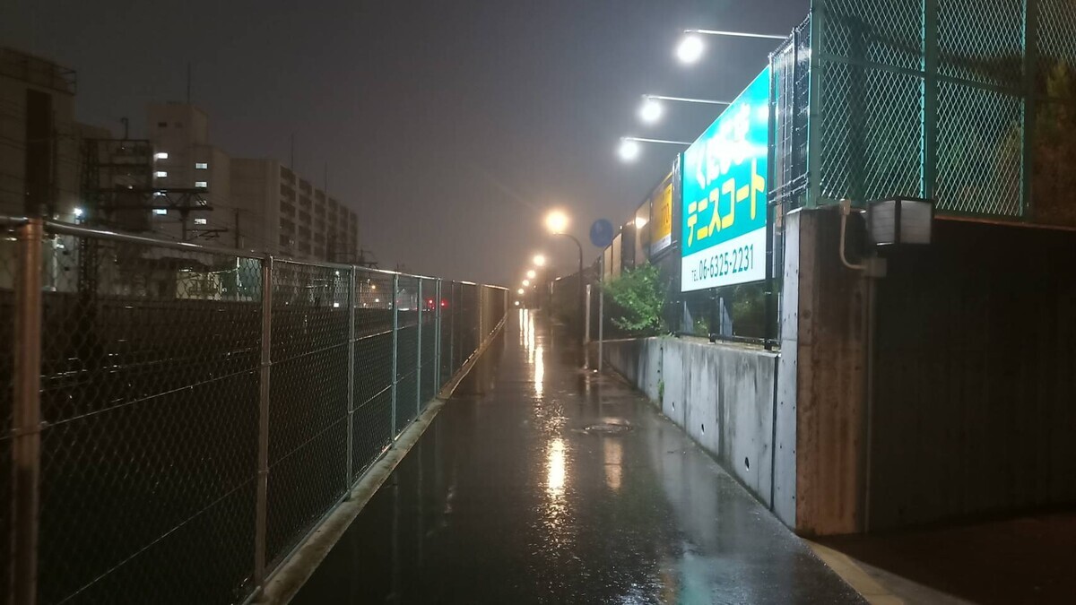 歩き出しは雨が止んでたんですが、柴島浄水場脇の暗い遊歩道に差し掛かった辺りでかなりの本降りに。