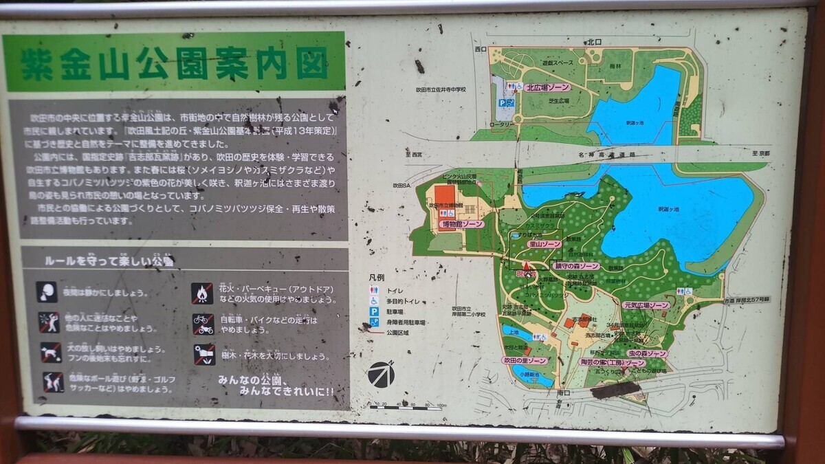紫金山公園は地図で見ると北と南に分かれております、釈迦ヶ池という名阪国道の下を通る大きな池と吉志部神社というそこそこ大きな神社、吹田市博物館もあるという良さげな公園。