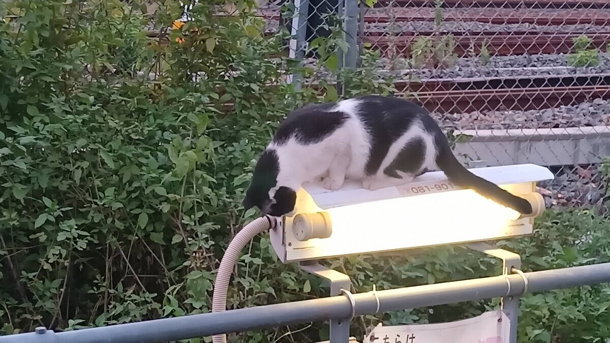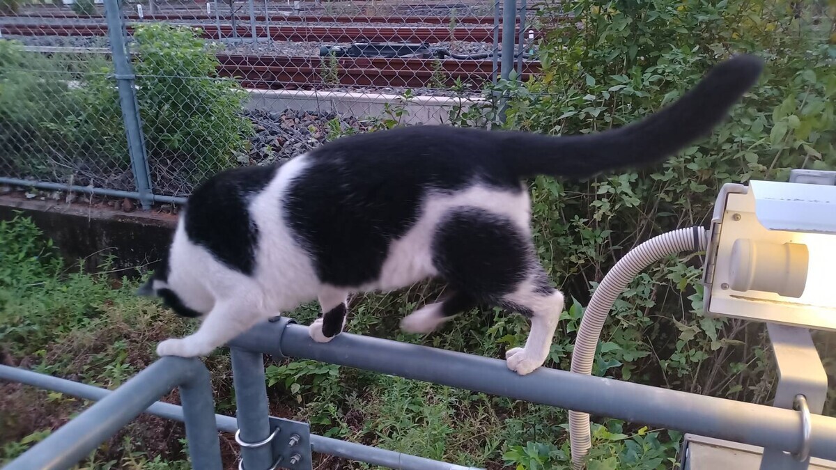 そして、並木の切られた新大阪駅近くの歩道で、超おっかなびっくり柵渡りチャレンジしてる猫に遭遇。