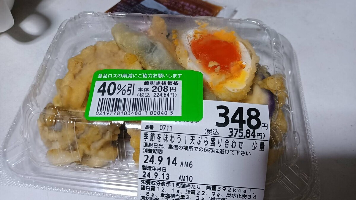 夜ウォーキングで仕入れてきた、半額の骨取り済みサバの西京焼きと天ぷら盛り合わせ。
