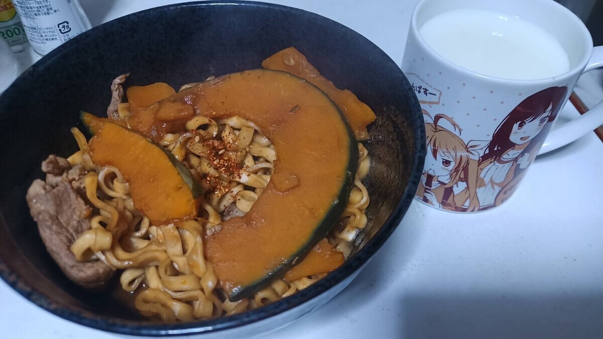朝ごはんはスガキヤの味噌煮込みうどんに、以前80円で買ってた、かぼちゃの薄切りを放り込んで、ちょっとほうとう風にしたいなと。